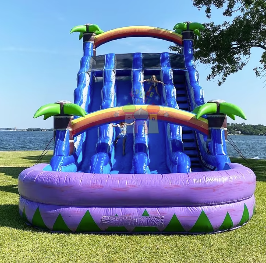 Prepare for the ultimate splash-down with the Triple Lane Waterfalls! This vibrant and towering water slide is the perfect centerpiece for any summer party, birthday, or event. Designed for high-energy fun and friendly competition, it features three parallel sliding lanes that let kids and adults race each other to the bottom. Each lane offers a thrilling, slippery descent, culminating in a giant, refreshing splash pool at the base. The slide's tropical theme, complete with inflatable palm trees and bright, eye-catching colors, instantly transforms your backyard into a paradise getaway. Constructed from durable, commercial-grade material, this slide is built for safety and endless hours of entertainment.